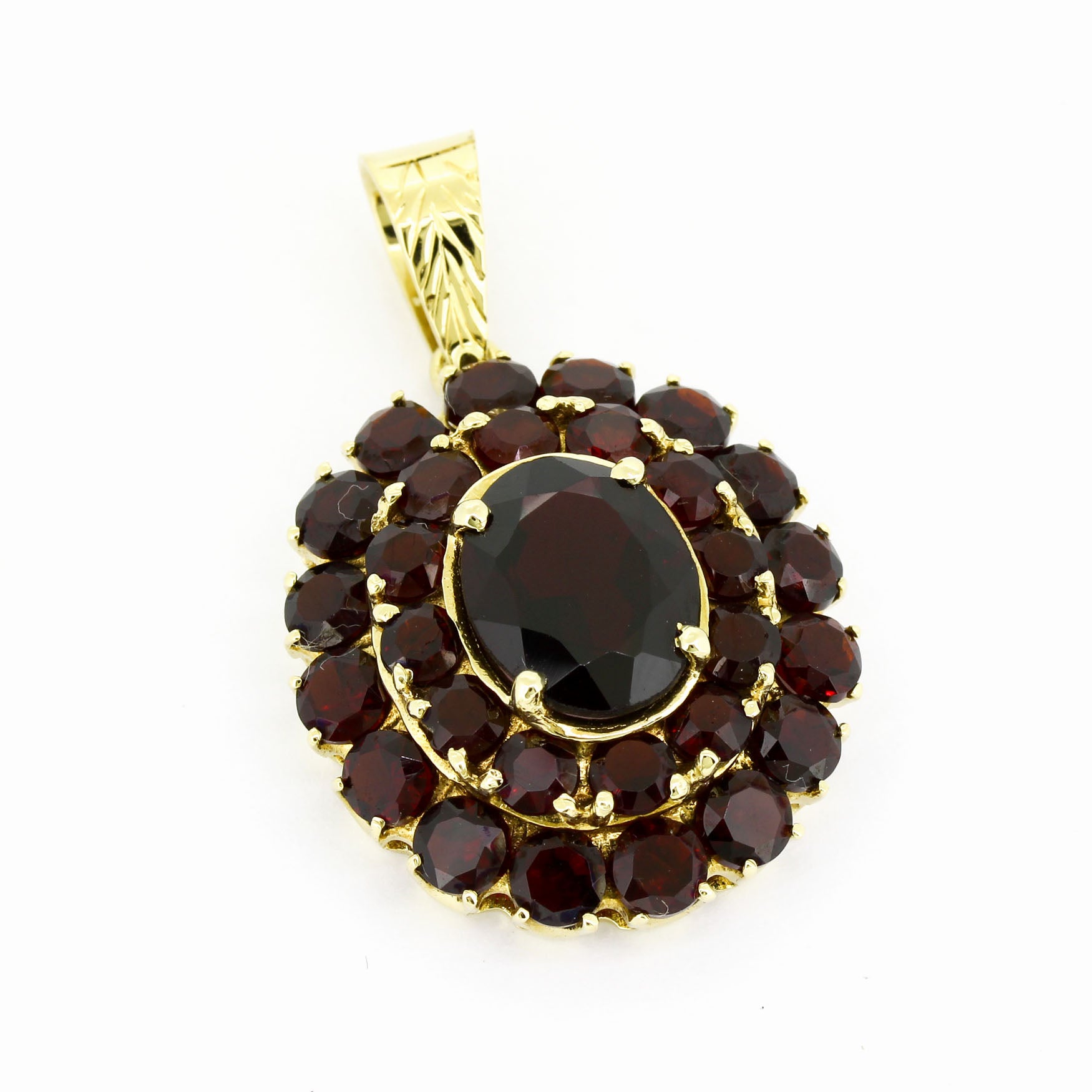 Wunderschöner, klassischer Anhänger aus 585er Gelbgold (gestempelt und geprüft) mit zahlreichen tiefroten Granaten in eleganter Anordnung.