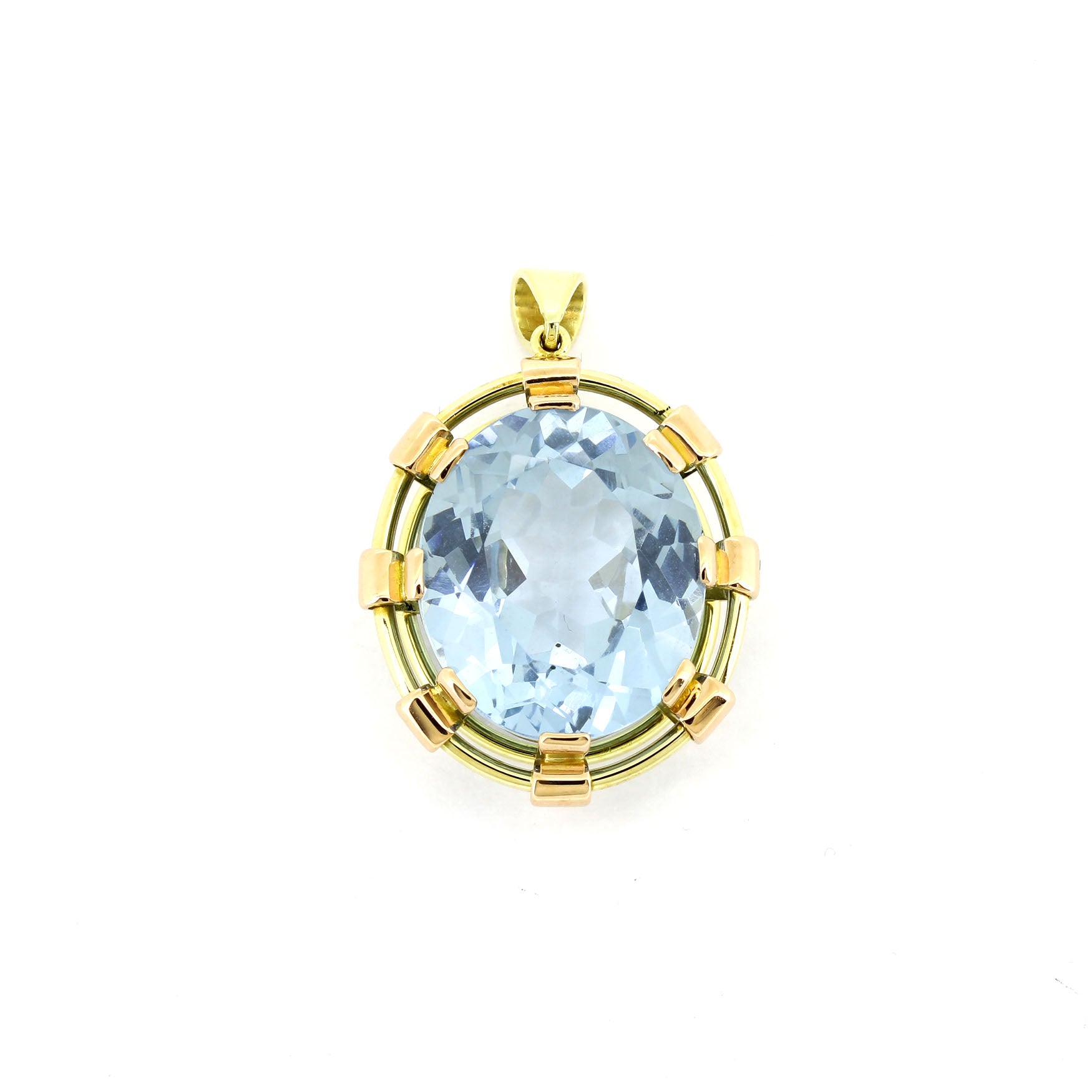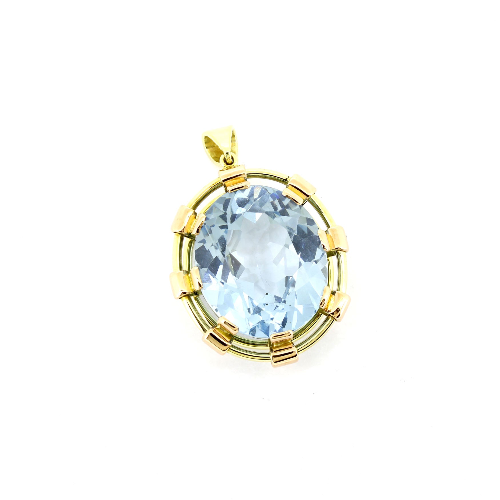 Im Mittelpunkt steht ein prachtvoller Blautopas, der dem Schmuckstück seine ausdrucksstarke Farbbrillanz verleiht.
