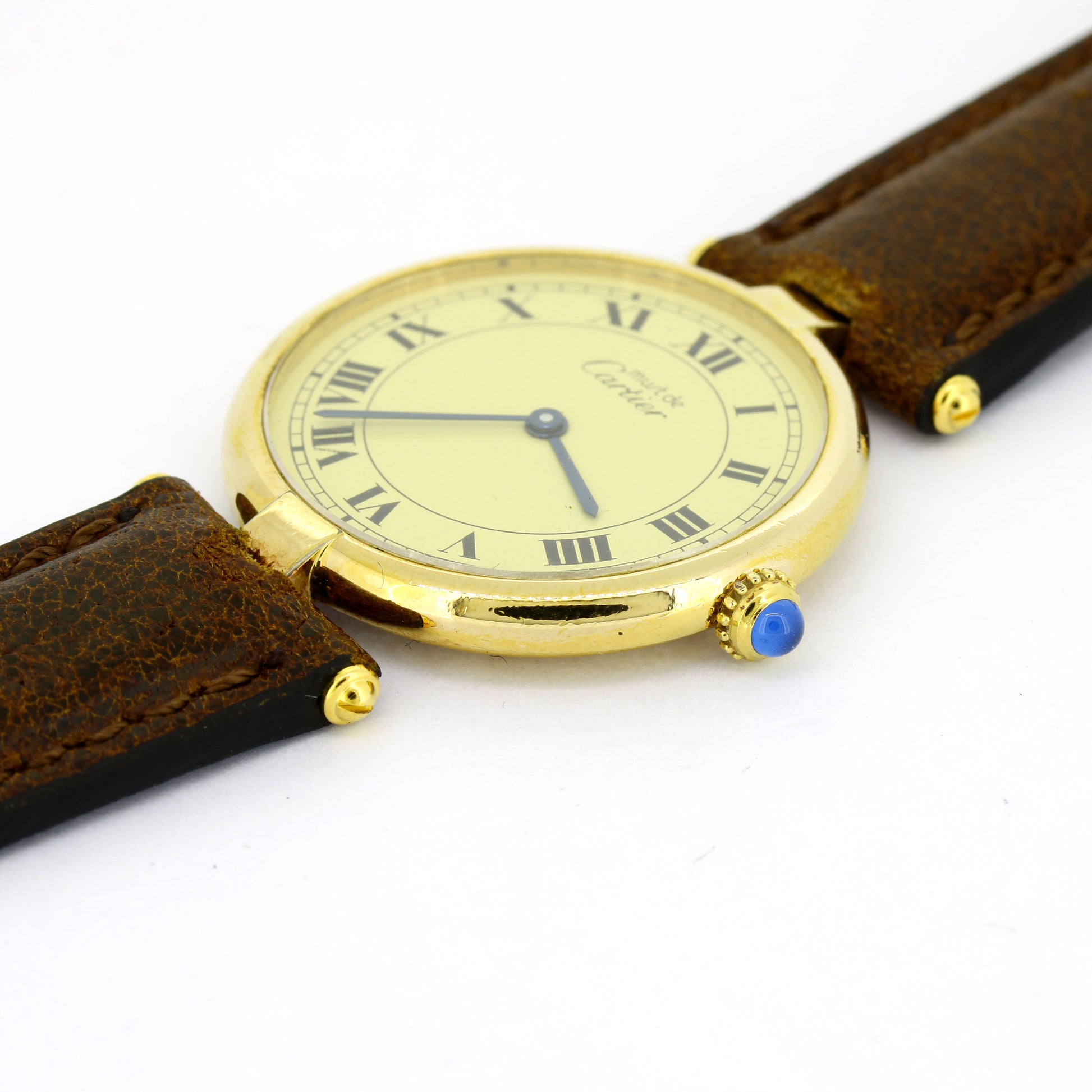 Elegante Cartier Must Vendôme Armbanduhr im zeitlosen Vintage-Stil. Die Uhr besticht durch ein vergoldetes Gehäuse aus Silber, ein präzises Quarzwerk und ein champagnerfarbenes Zifferblatt, das klassische Raffinesse ausstrahlt. Die ikonische Krone ist mit einem edlen Saphir verziert, ein typisches Merkmal von Cartier. Ein außergewöhnliches Sammlerstück und stilvoller Begleiter für Liebhaber exklusiver Uhren.