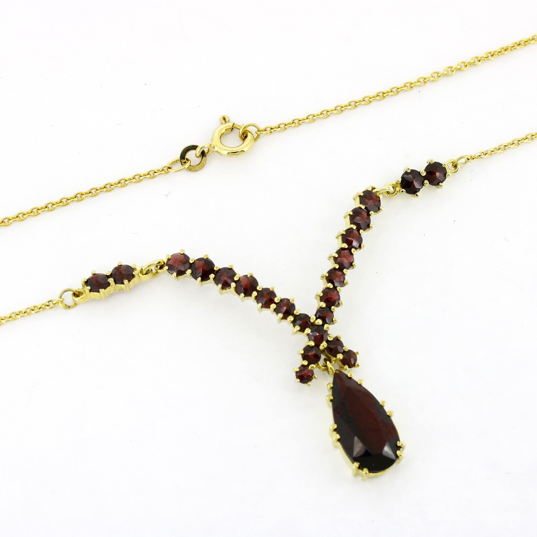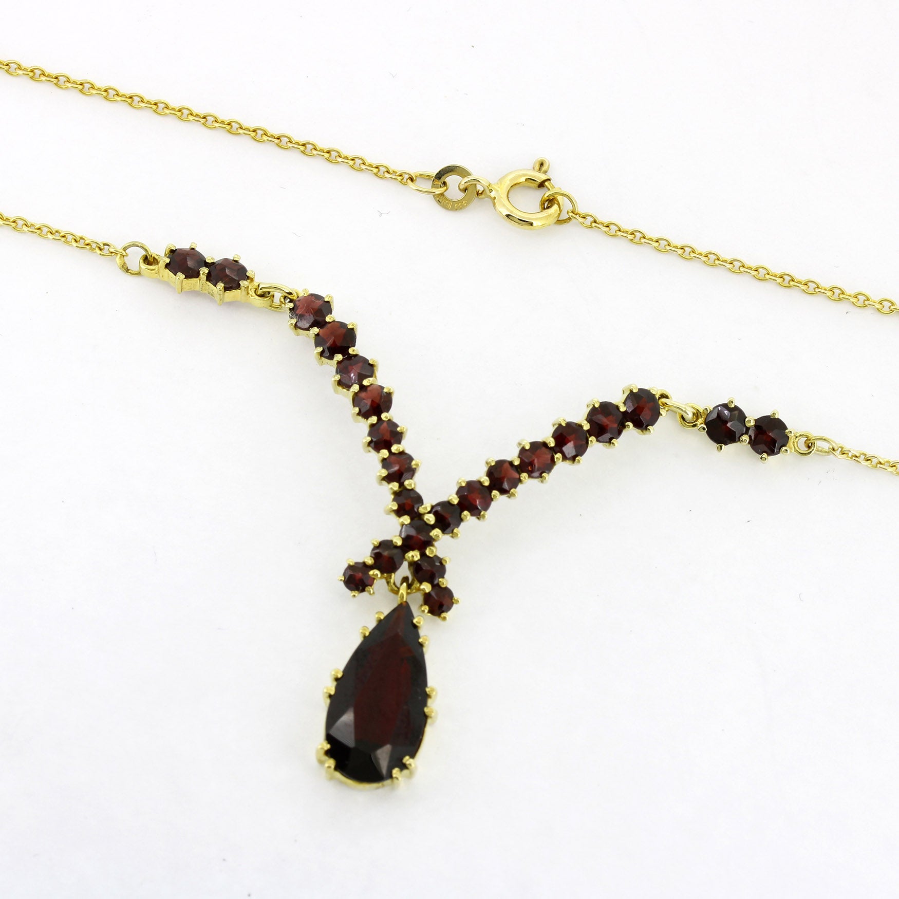 Elegantes Collier aus 333 Gelbgold, gestempelt und geprüft, geschmückt mit einem tiefroten Granat. Das Schmuckstück hat ein Gesamtgewicht von ca. 6,63 g und eine Kettenlänge von ca. 46 cm. Es befindet sich in sehr gutem Zustand, professionell aufgearbeitet von einem erfahrenen Goldschmied.