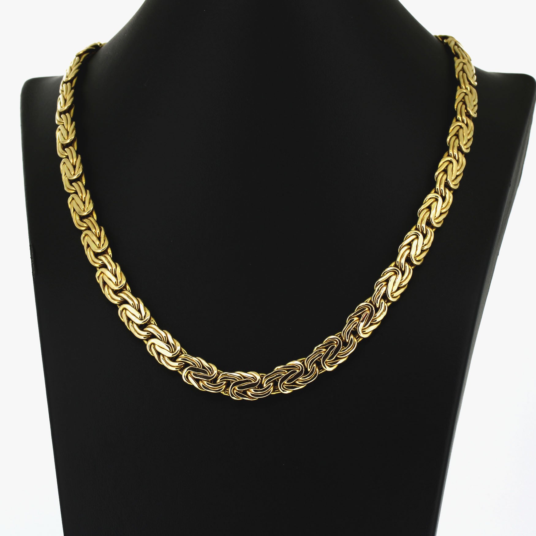 Massive und hochwertige Kette aus 585er Gelbgold (gestempelt und geprüft) mit einem Gesamtgewicht von ca. 40,05 g. Die Kette misst ca. 46 cm in der Länge, hat eine Breite von ca. 6,8 mm und eine Stärke von ca. 3,5 mm.