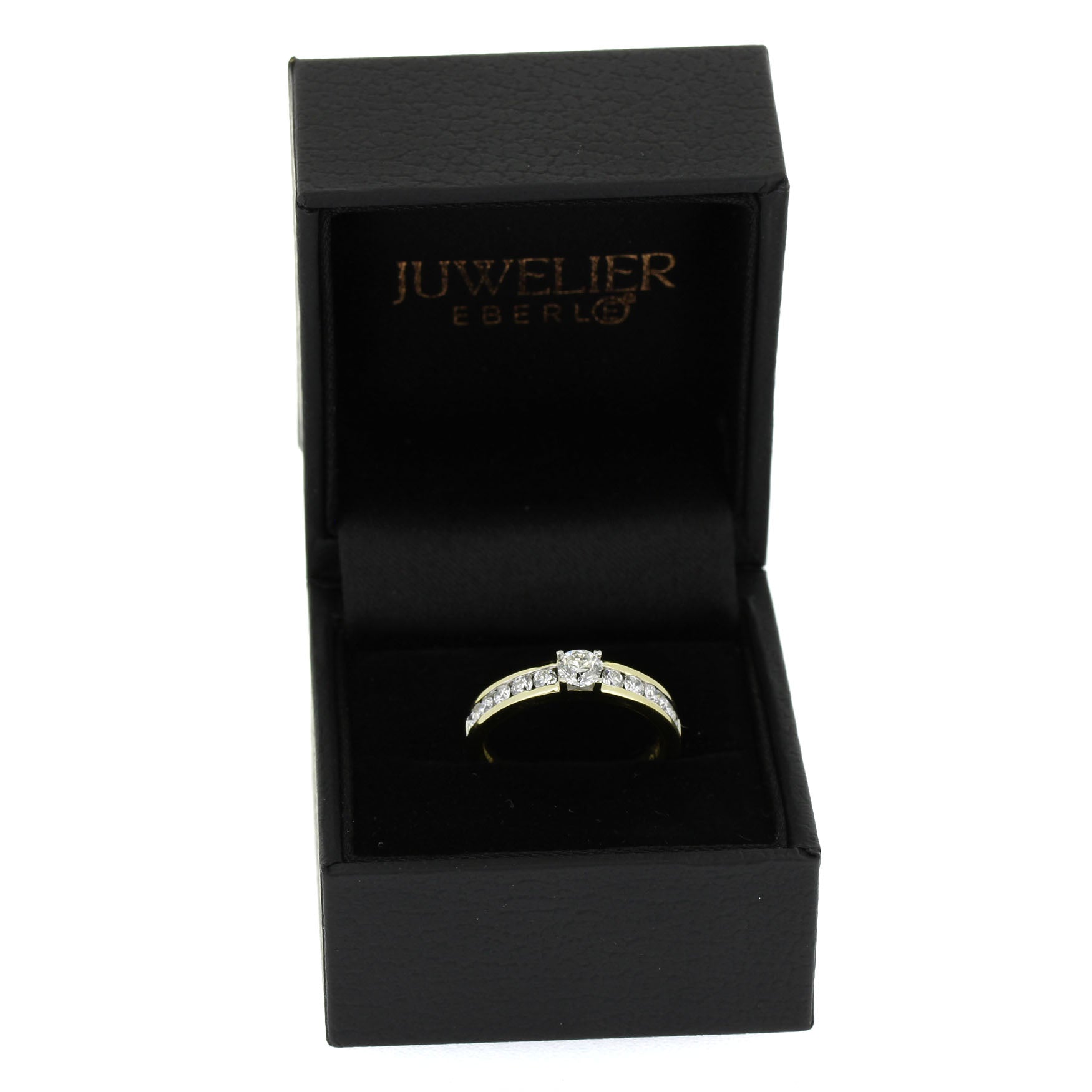 Eleganter Damenring aus 585er Gelbgold (gestempelt und geprüft) mit einem Gesamtgewicht von ca. 3,94 g. Der Ring ist in Größe 53 gefertigt und mit Brillanten von insgesamt ca. 0,75 ct besetzt. Die Steine haben die Qualität W/SI (Weiß, kleine Einschlüsse).